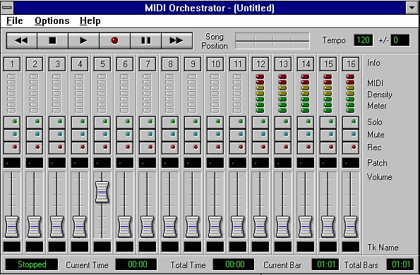 The Volume Slider(s) let the user increase or decrease the playback volume of each channel. Status Area The Status Area displays information about the current song file and the status of the MIDI Orchestrator itself (Playing, Paused, Recording,