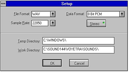 Displays the Setup dialog box for selecting the File Format (VOC or WAV), Sample Rate, Stereo/Mono, Bit Length/Data Format,Temp Directory and Work Directory . When