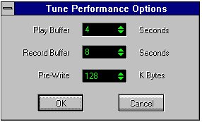 If encountering difficulties during playback of a high data rate file (i.e. 44k, 16 bit, stereo), try to increase the value of the Play Buffer. If encountering difficulties while recording, try to increase the value of the Record Buffer. Or increase the size of the Pre-Write value. It should be equal to the maximum size of the file being recorded (in Kilobytes).